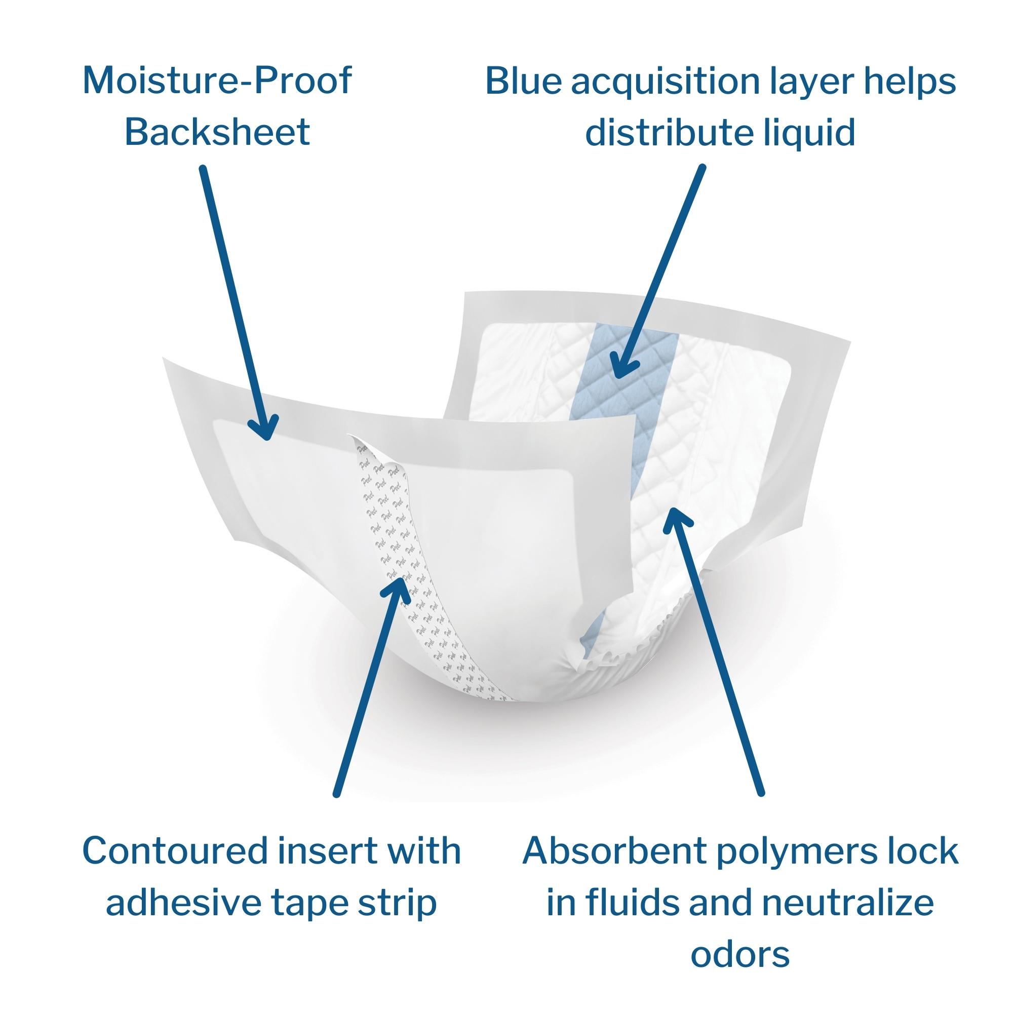 - Super-absorbent core system wicks fluid away from the skin and distributes it into the brief underneath
