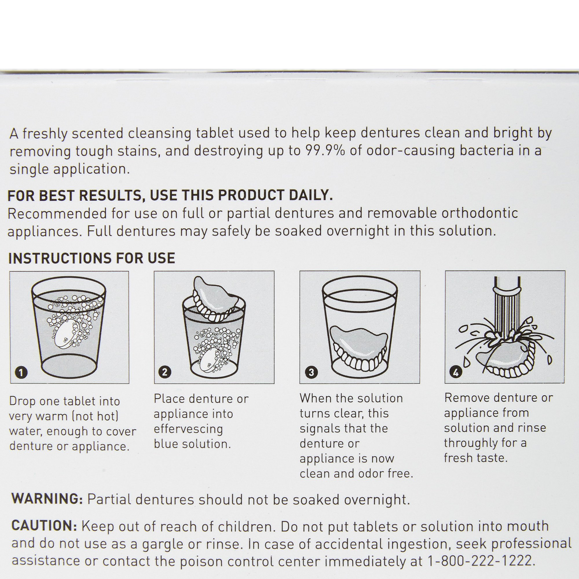 - A freshly scented cleansing tablet used to help keep dentures clean and bright by removing tough stains, and destroying up to 99.9% of odor-causing bacteria in a single application