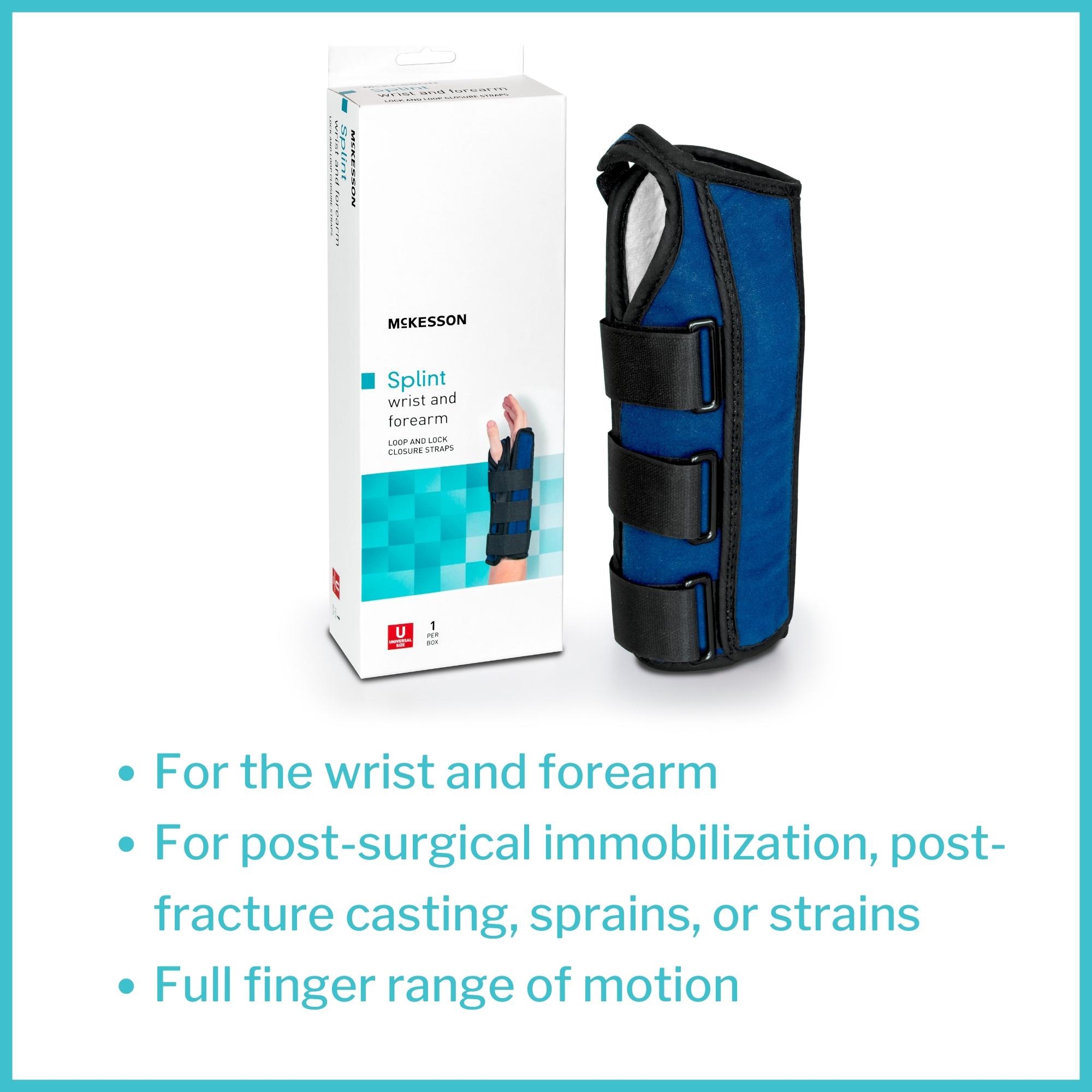 - Wrist and forearm immobilization: 10-inch brace used to aid in post-surgical immobilization, post-fracture casting, and wrist sprains or strains